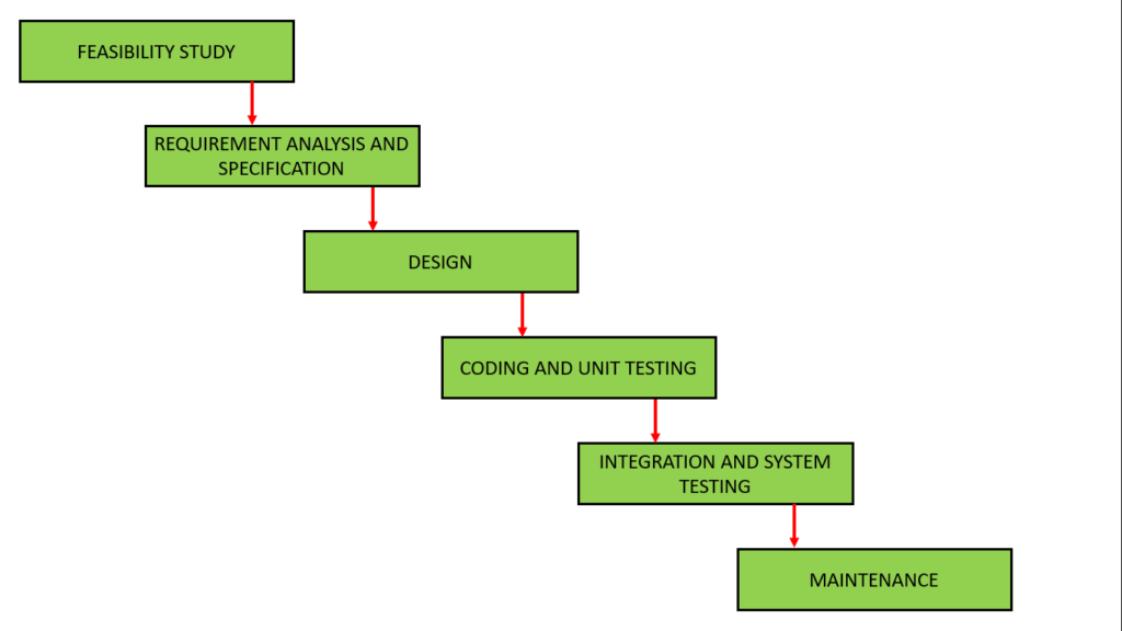 Waterfall is one most traditional software development methodology that follows an incremental and sequential approach. In the waterfall there are at least 6 phases of development. The six phases are requirements analysis, design, implementation, testing, deployment, and maintenance. And the most important thing is each phase is completed before moving to the next phase, and no change or revision are done once a phase is completed.